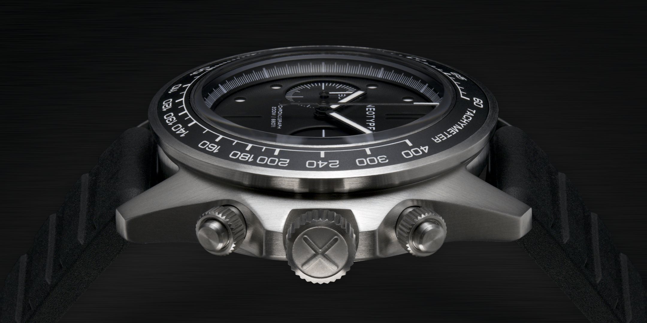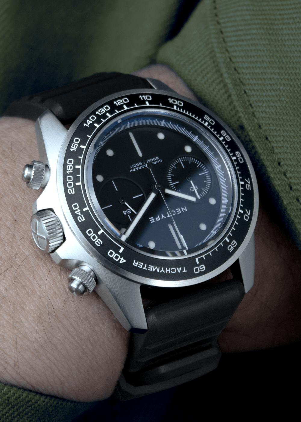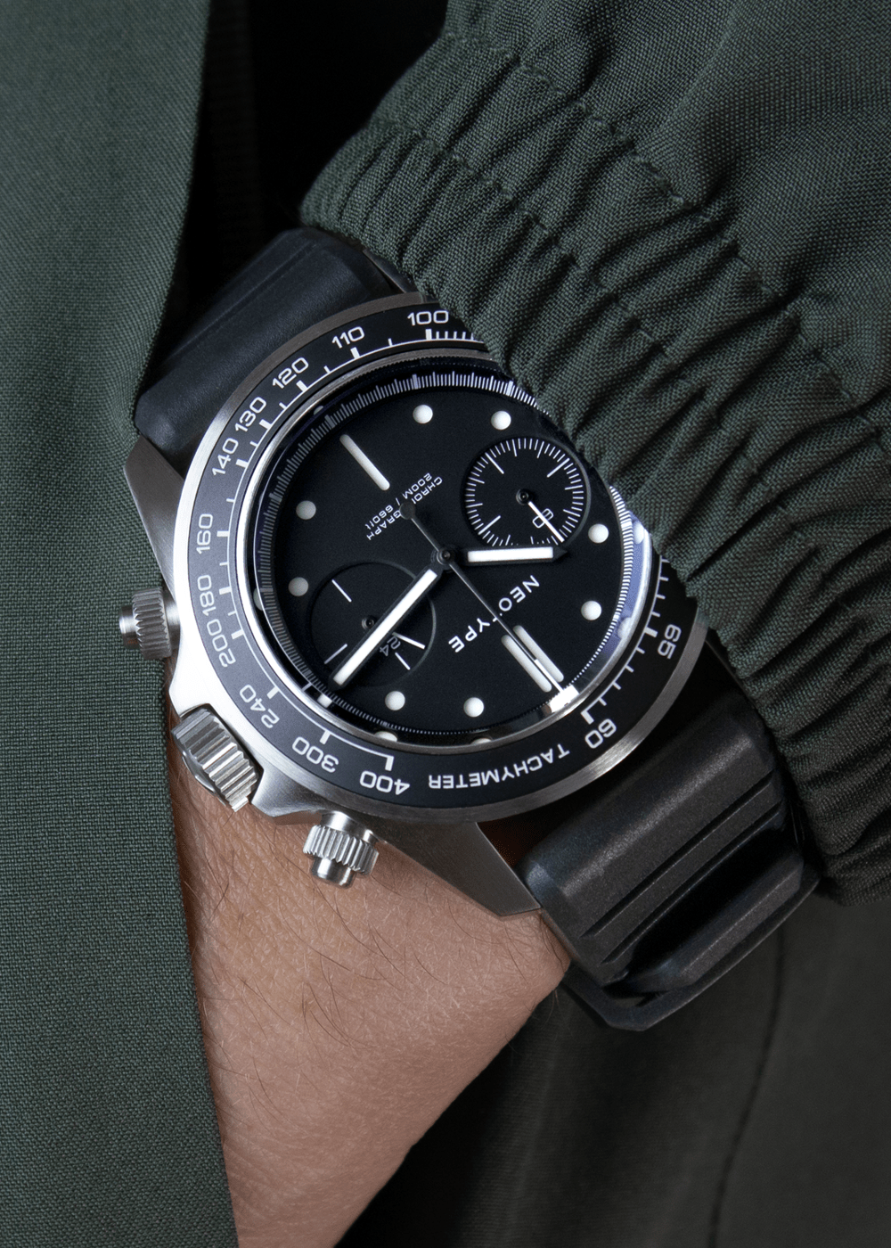 Montre chronographe Neotype Watches pour homme avec bracelet en caoutchouc FKM, vue de face, offrant une grande fiabilité et une finition moderne.