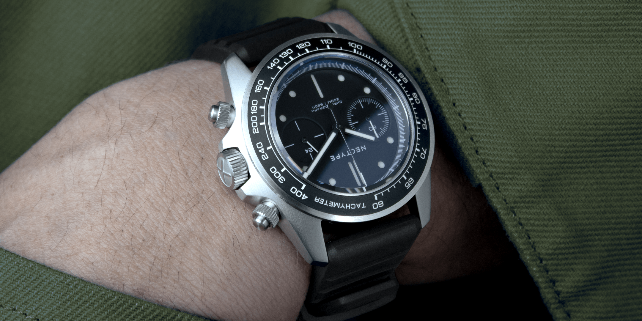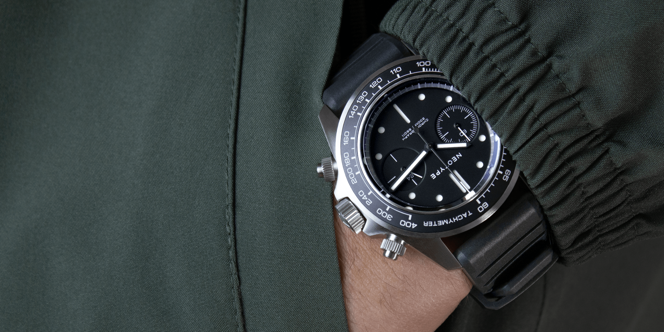Montre chronographe Neotype Watches portée au poignet masculin, mettant en valeur le design robuste et élégant du cadran et du bracelet.