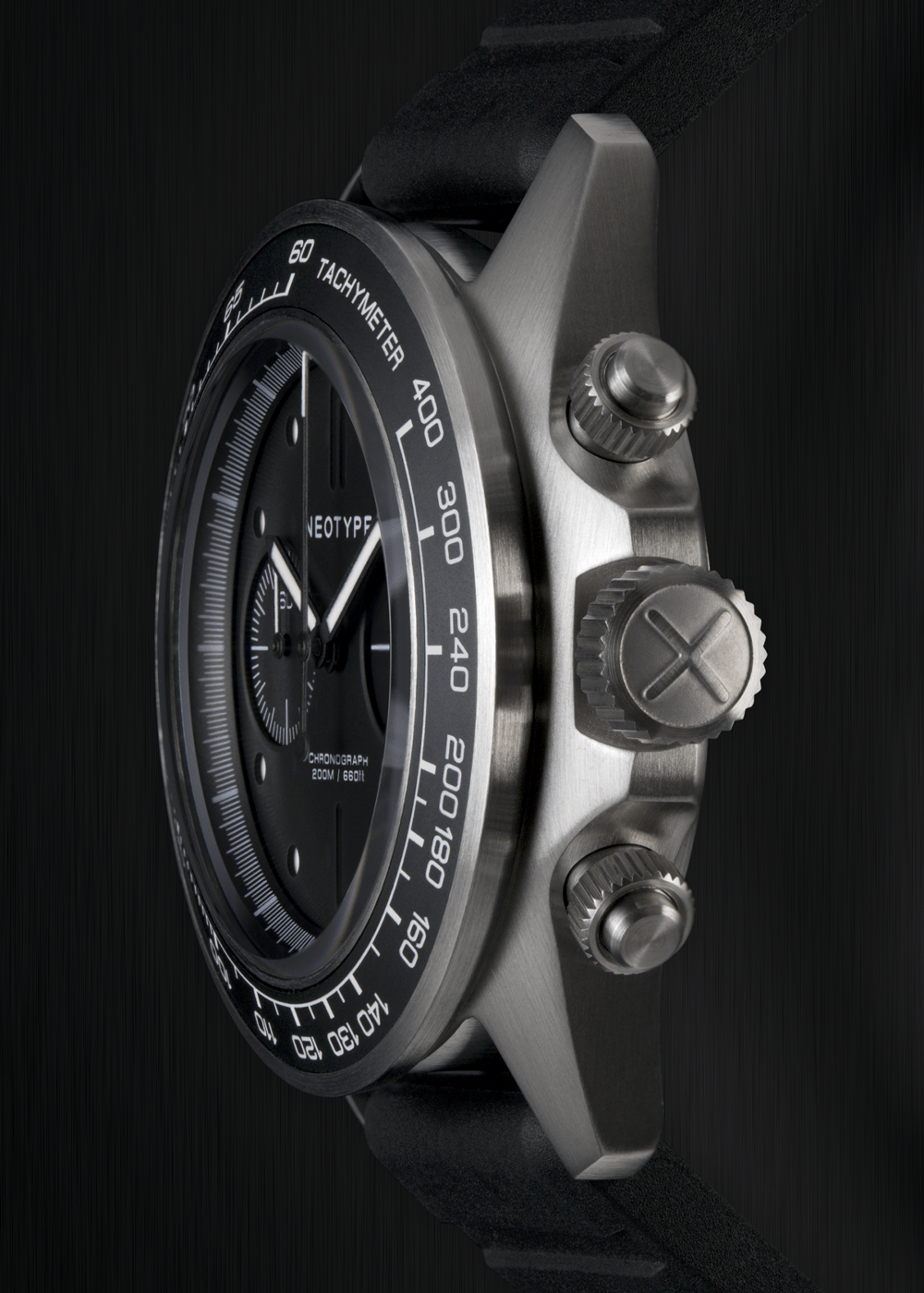 Montre chronographe Neotype Watches pour homme vue de profil, montrant l'épaisseur du boîtier en acier inoxydable et le design latéral du bracelet.